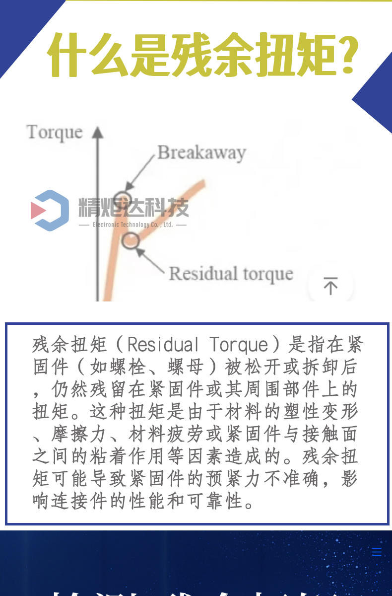 殘余扭矩扳手的松脫法,又稱松脫檢測法:松脫扭矩乘以一個系數(shù),一般1.1-1.2解釋:將已經(jīng)緊固的螺栓,用扭力扳手慢慢使其松開,然后讀取其開始轉(zhuǎn)動那一剎那的瞬時扭矩值,此時的扭矩理論上應(yīng)該是峰值,繼續(xù)扭動的數(shù)值都會小于這個峰值。這個峰值還不是我們想要檢測的殘余扭矩,因為經(jīng)驗發(fā)現(xiàn),這個值和真正的殘余扭矩相比偏小,所以通常會把這個值乘以一個系數(shù),約為1.1至1.2之間,根據(jù)實際情況調(diào)整。計算以后的數(shù)值我們認為才是我們想要的殘余扭矩。3.松-緊法:檢驗前先在被檢螺栓或螺母頭部與被連接體上劃一道線,確認相互的原始位置。然后將螺栓或螺母松開些,在用扭矩扳手將螺栓或螺母擰緊到原始位置,這時的最大扭矩值再乘以0.9~1.1所得的值即為需要的殘余扭矩。解釋:當殘余扭矩大于擰緊扭矩時,說明被測緊固處可能被過度擰緊。為避免過度擰緊的風險,采用松-緊法。不適宜有防松功能的緊固件。